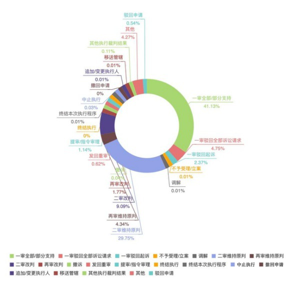 據不完全統(tǒng)計三年的案件數量達到52760件:一審全部支持達到41.13%,不服一審判決二審維持原判達29.75%。