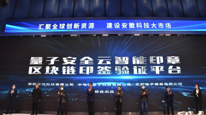 圖為12月中旬舉辦的安徽科技大市場科技成果轉(zhuǎn)化交易會上,“量子安 全云智能印章及區(qū)塊鏈印簽驗證平臺”正式發(fā)布