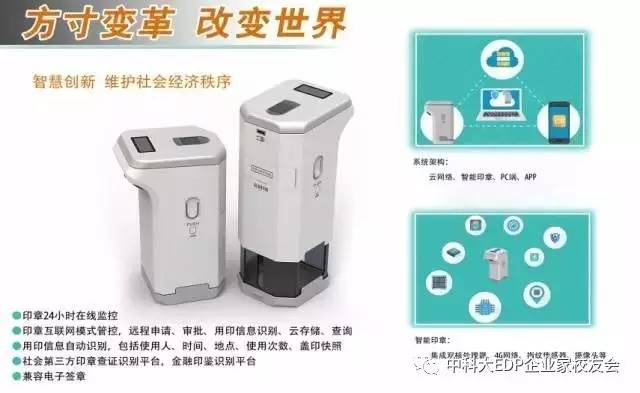 據(jù)童總介紹,云智能印章2015年開始研發(fā),2016年底開發(fā)出工程機,目前產(chǎn)品已小規(guī)模生產(chǎn)、銷售。未來5年,云智能印章將替代目前30%-50%的傳統(tǒng)印章,解決印章管控的難題。云智能印章與傳統(tǒng)印章相比,不僅是做到安 全管控,還能實現(xiàn)互聯(lián)網(wǎng)遠程管理,包括遠程申請、審批、授權、監(jiān)控。下一步,團隊將在云智能印章中,融合電子遠程簽章系統(tǒng),使互聯(lián)網(wǎng)云智能印章實現(xiàn)有紙實物蓋章和無紙電子簽章的無縫覆蓋。同時,除了印章系統(tǒng),個人簽名系統(tǒng)和云智能簽字筆也在開發(fā)中,不久將推向市場。項目充分運用物聯(lián)網(wǎng)技術,專注內(nèi)控流程管控和痕跡管理,解決管理流程漏洞和效率問題。