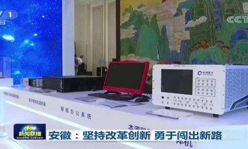 中共安徽省委書記李錦斌、省長李國英、安徽創(chuàng)新館主任陳林等向與會中 央領(lǐng)導(dǎo)介紹自主可控量子安 全云智能辦公系統(tǒng)
