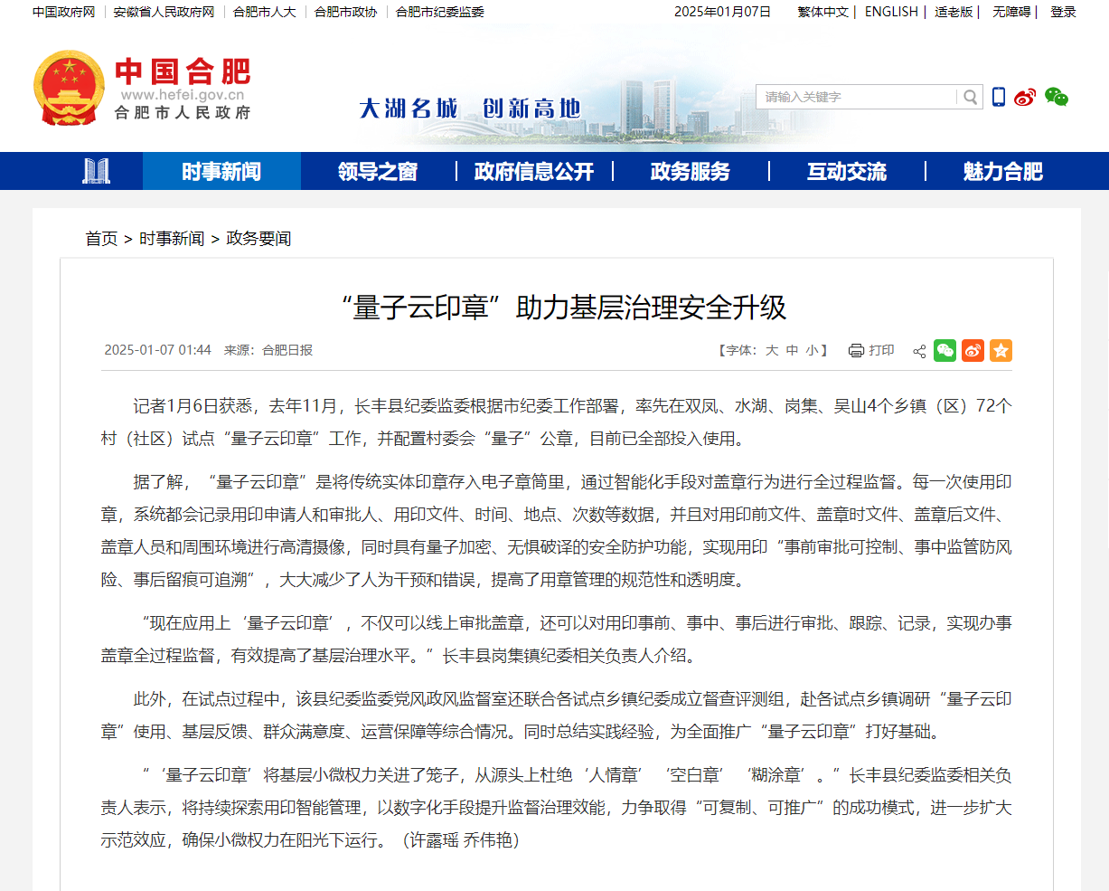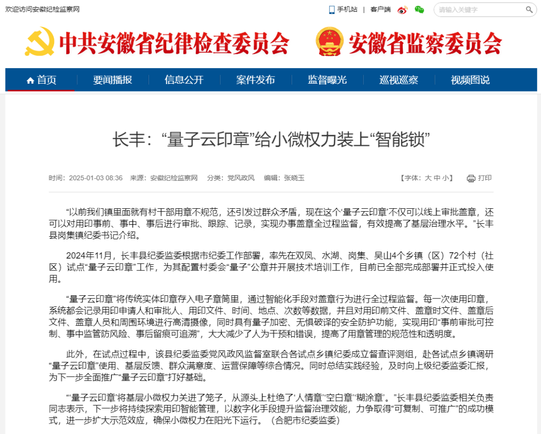 近日,安徽省合肥市長豐縣試點(diǎn)引入中電信量子集團(tuán)與云璽量子、科大國盾多年共同研發(fā)出的“量子云印章”管理體系,構(gòu)建了全新的村級印章管理模式,旨在實(shí)現(xiàn)基層治理和小微權(quán)力治理創(chuàng)新。此舉措引發(fā)了廣泛的關(guān)注,并得到了安徽紀(jì)檢監(jiān)察網(wǎng)、合肥市紀(jì)委監(jiān)委以及長豐縣紀(jì)檢監(jiān)察網(wǎng)等多個官方平臺的報道。原文如下:…