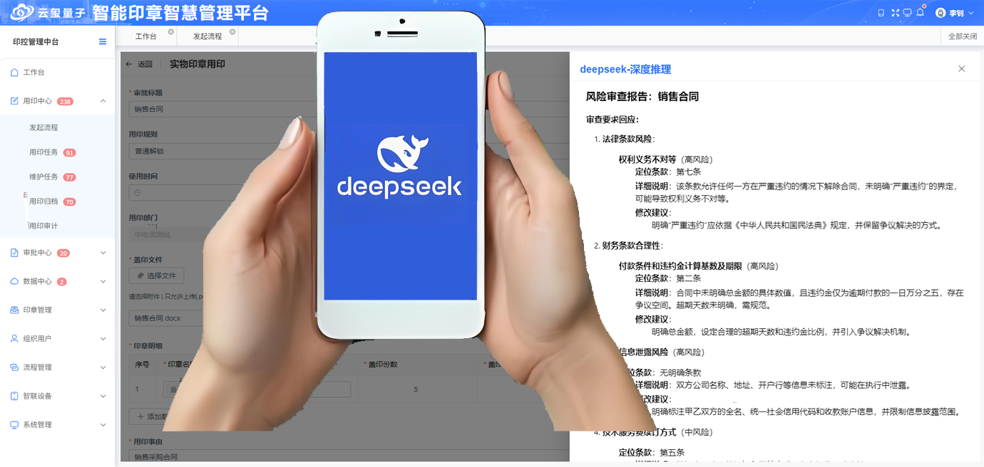 近日,中國智能印章原創(chuàng)發(fā)明人、標(biāo)準(zhǔn)主導(dǎo)起草者、行業(yè)領(lǐng)導(dǎo)者,云璽量子再實(shí)現(xiàn)智能印章行業(yè)的重大技術(shù)突破,正式官宣云璽量子智能印章智慧管理平臺實(shí)現(xiàn)DeepSeek大模型深度創(chuàng)新融合。通過高階AI技術(shù)賦能,實(shí)現(xiàn)AI智能印章與AI智能合同全流程高階AI智能化管理,打造全流程、全功能、無漏洞的AI…