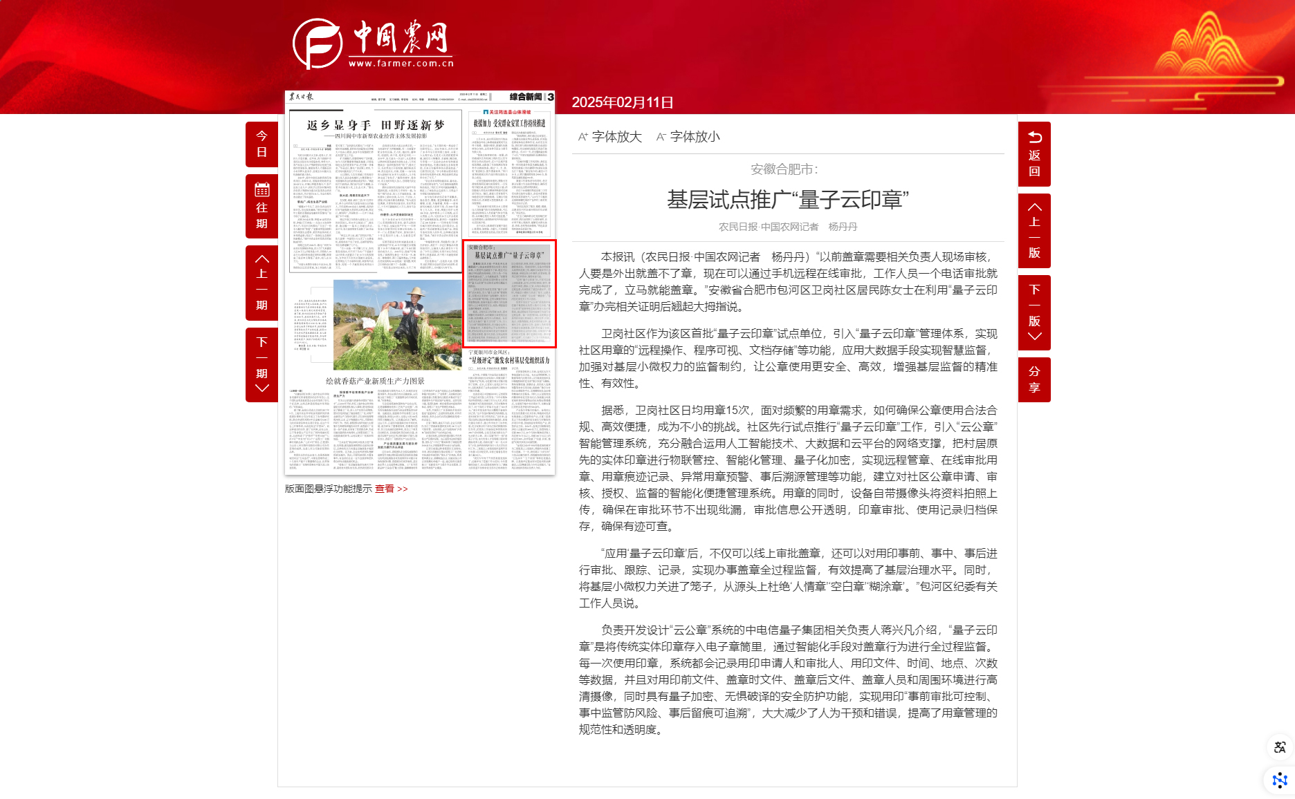 近期,安徽省合肥市長豐縣試點(diǎn)引入由中電信量子集團(tuán)與云璽量子、科大國盾多年共同研發(fā)出的世界首款“量子云印章”,通過智能化手段對蓋章行為進(jìn)行全過程監(jiān)督,提高了用章管理的規(guī)范性和透明度,有效提升了基層治理水平。此舉受到了社會各界的廣泛關(guān)注,合肥市政府官方網(wǎng)站、合肥日報等多平臺對此進(jìn)行了報道?!?/p>