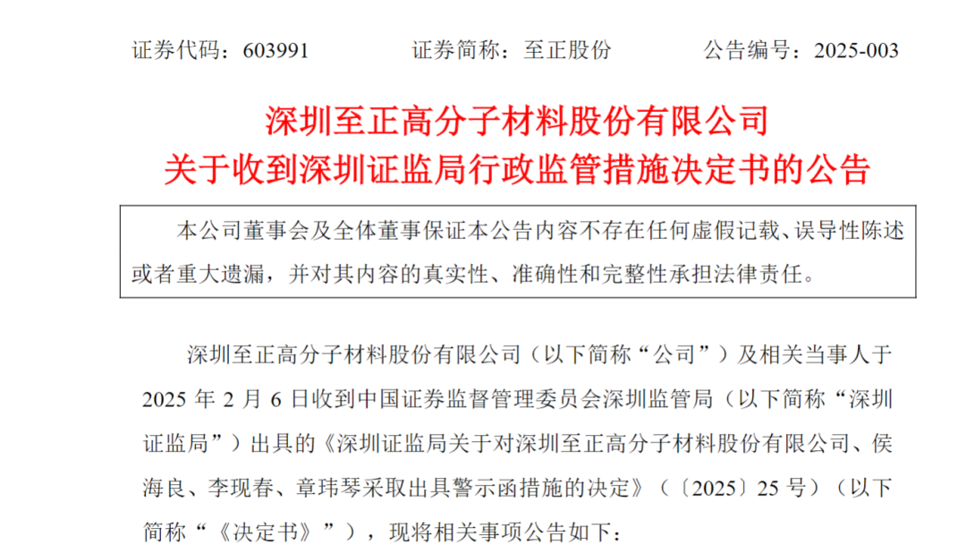 2月6日晚間,至正股份公告稱公司收到深圳監(jiān)管局行政監(jiān)管措施決定書,起因是公司原實(shí)際控制人及時任董事長侯海良違規(guī)擔(dān)保未履行相關(guān)信披義務(wù)和審批程序。事件回溯2020年4月,至正股份原董事長侯海良私自外借公司公章簽署違規(guī)擔(dān)保協(xié)議,導(dǎo)致企業(yè)卷入近千萬元債務(wù)糾紛。盡管事后達(dá)成和解,但該事件因未經(jīng)…