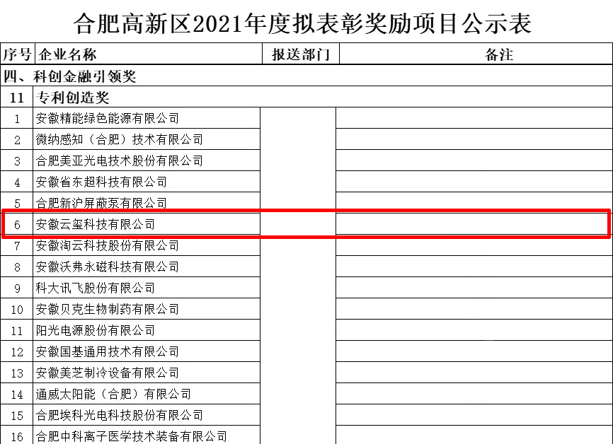 云璽量子·榮登榜單近日,合肥市高新區(qū)對(duì)2021年度擬表彰獎(jiǎng)勵(lì)項(xiàng)目做出了公示,安徽云璽量子科技有限公司喜登榜單,榮獲科創(chuàng)金融引領(lǐng)獎(jiǎng)中專利創(chuàng)造獎(jiǎng)。專利創(chuàng)造獎(jiǎng):①對(duì)當(dāng)年知識(shí)產(chǎn)權(quán)創(chuàng)造、運(yùn)用、管理、保護(hù)、服務(wù)突出的單位,給予獎(jiǎng)勵(lì);②對(duì)當(dāng)年獲得國(guó)家級(jí)、省級(jí)知識(shí)產(chǎn)權(quán)獎(jiǎng)項(xiàng)、榮譽(yù)的單位,給予獎(jiǎng)勵(lì);③對(duì)當(dāng)…
